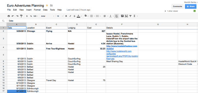 Whether you prefer to meticulously plan your trip, or keep things flexible as you go, it is still beneficial to keep track of several vital details concerning your adventures. I have found that a Google Drive excel document is a great way to organize your thoughts and plans, as well as an easy way to share them with friends and family. You have the option of allowing for editing or just viewing privileges. When Rachel and I planned our 2012 National Park Road Trip, we had to communicate from different states and while on very different schedules. We could work on the same file independently or together as we found time.