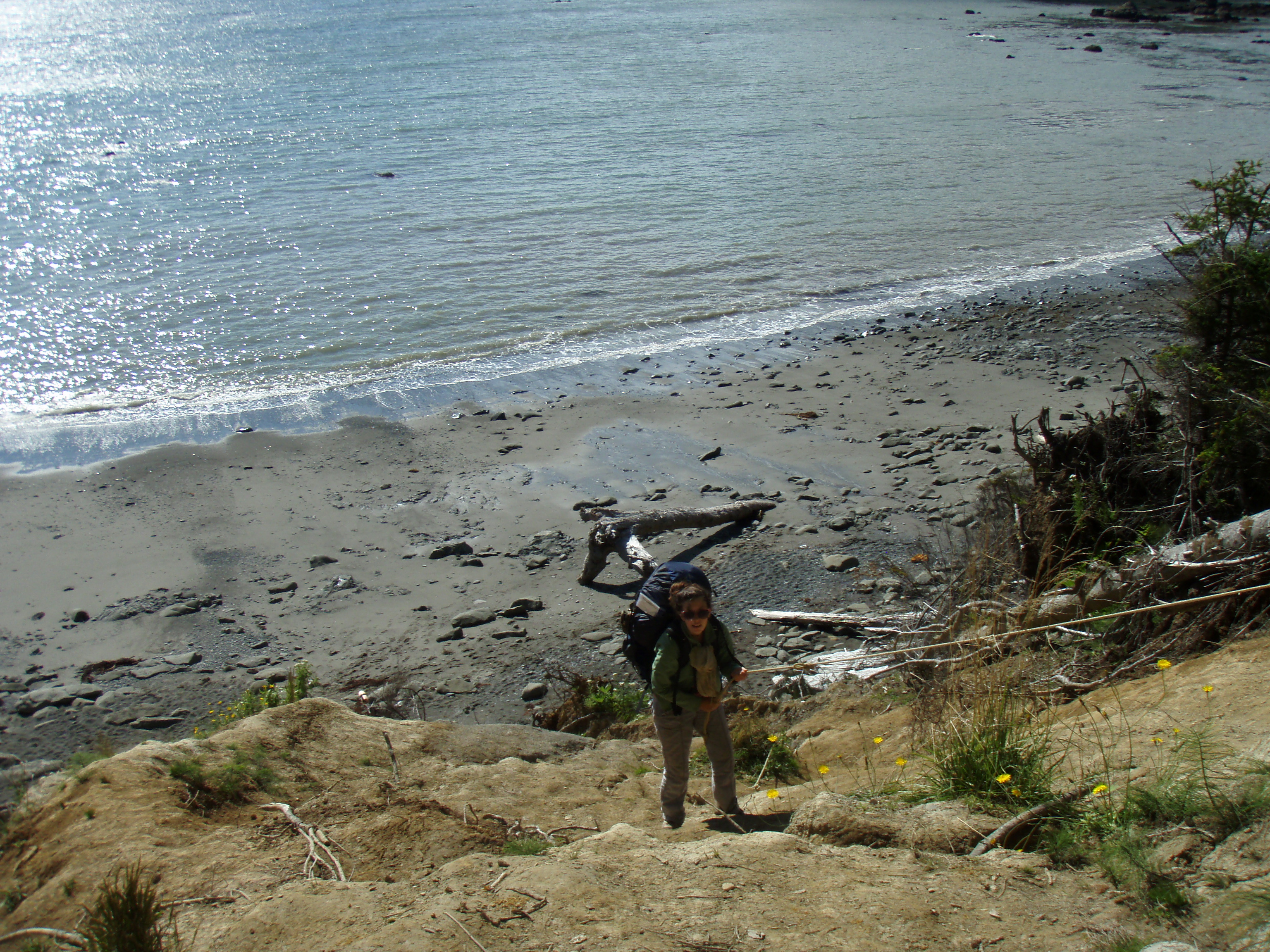 Our friendly park ranger from yesterday morning had helped us look at the tide chart so we could time our hike with the low tide, when the largest part of the beach was accessable to hikers. He also described the path we were taking as “Not your Momma’s walk on the beach,” which wasn’t very descriptive as to what we would encounter once we started our walk. Dude, you did not mention the part where we had to use ropes to climb up the bank when the trail hopped off the beach and into the forest! He also asked if we needed our hike to be a loop trail becuase “loop trails are the new black.”
