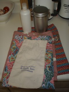 Here are a few reusable shopping tips I’ve developed over the years. First, buy one of these amazing ChicoBags or something similar. Put it in your car or your handbag/manbag. This is great for when you are just running to the store during the week and forget your normal fleet of reusable bags, or when you get a little excited at the store on the weekend and end up needing an extra shopping bag. Second, even if you have no bulk section and your deli is not allowing you to use your own container you can easily cut down your waste in the produce section by choosing products that aren’t wrapped in plastic and then bagging them with reused plastic/paper bags from home. I have a small collection of bags I used to put my store bought produce in before my mother made me a set of awesome bulk bags for Christmas.